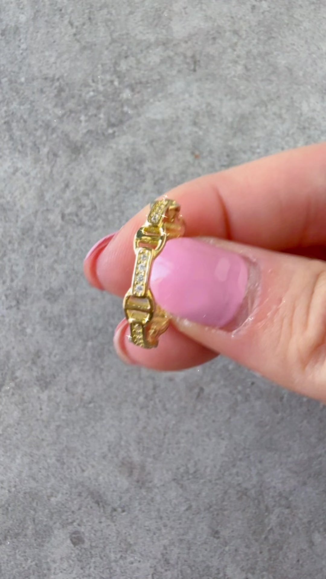 This gold buckle-style ring features a continuous link pattern adorned with shimmering cubic zirconia stones that catch the light from every angle. Its polished gold finish and modern geometric shape make it a standout piece for everyday wear or elegant evening looks.