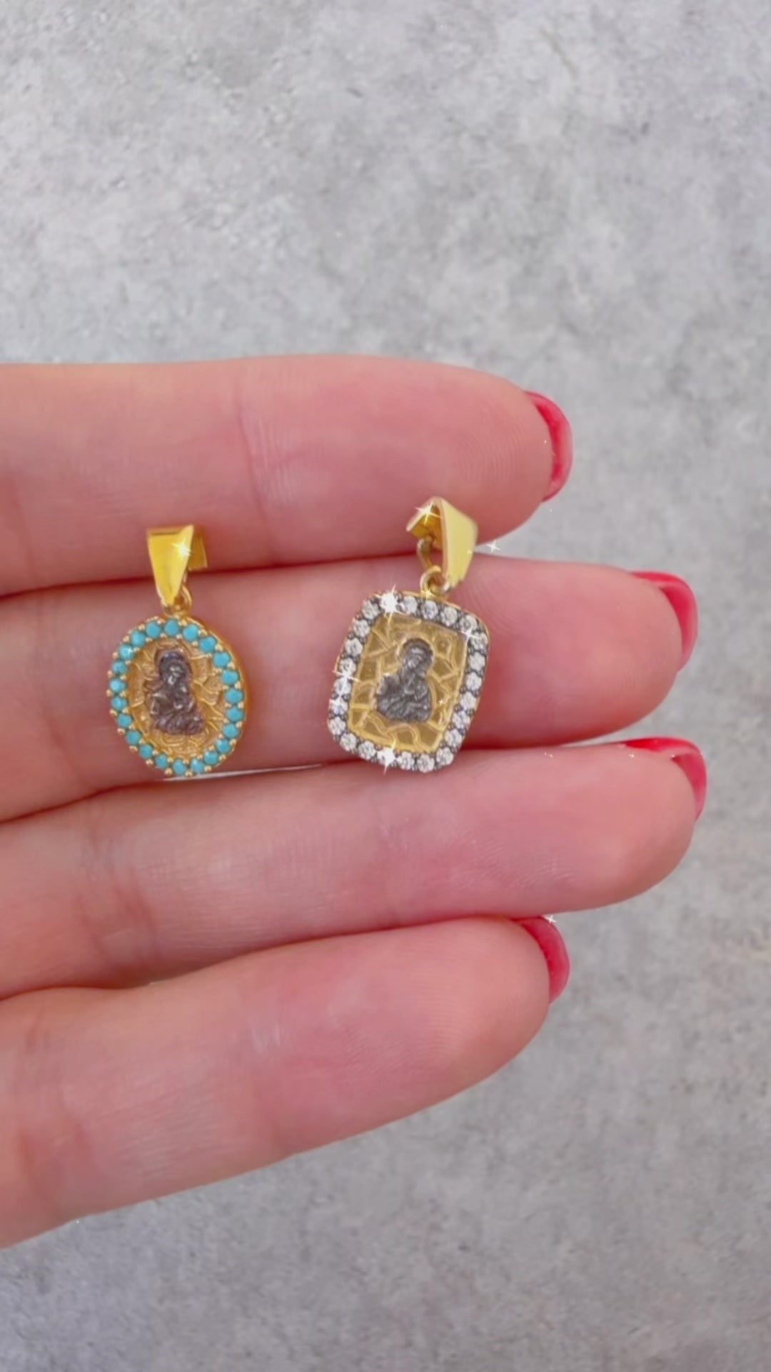 What makes it special: This refined pendant depicts the Virgin Mary holding the baby Jesus, a powerful symbol of maternal protection, faith, and unconditional love. Encircled by turquoise-toned stones, the oval medallion balances spiritual meaning with elegant design, making it a timeless piece you’ll reach for daily.