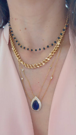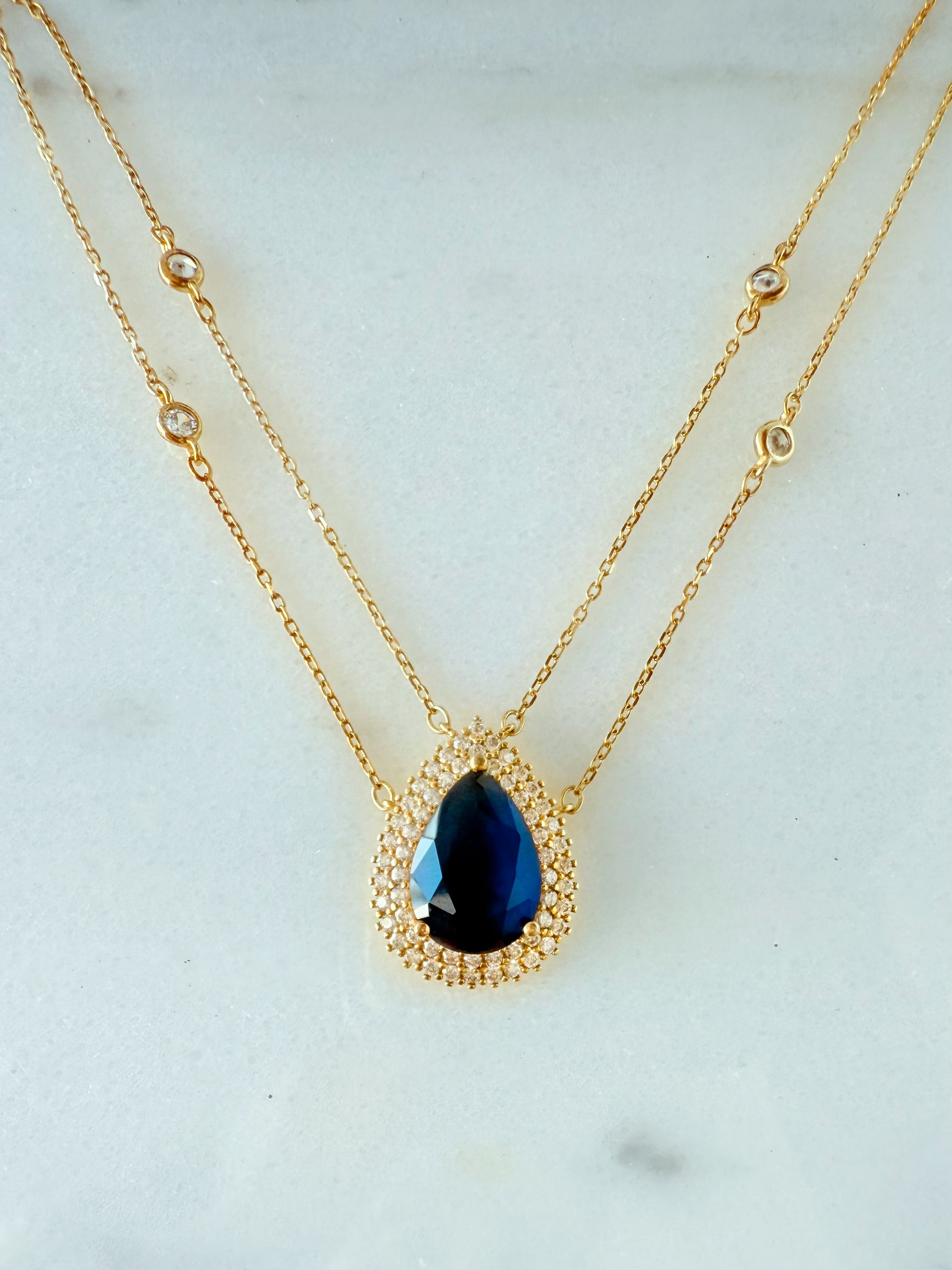 Gold Sapphire Blue Teardrop Pendant Necklace – Double Chain with Cubic Zirconia Details