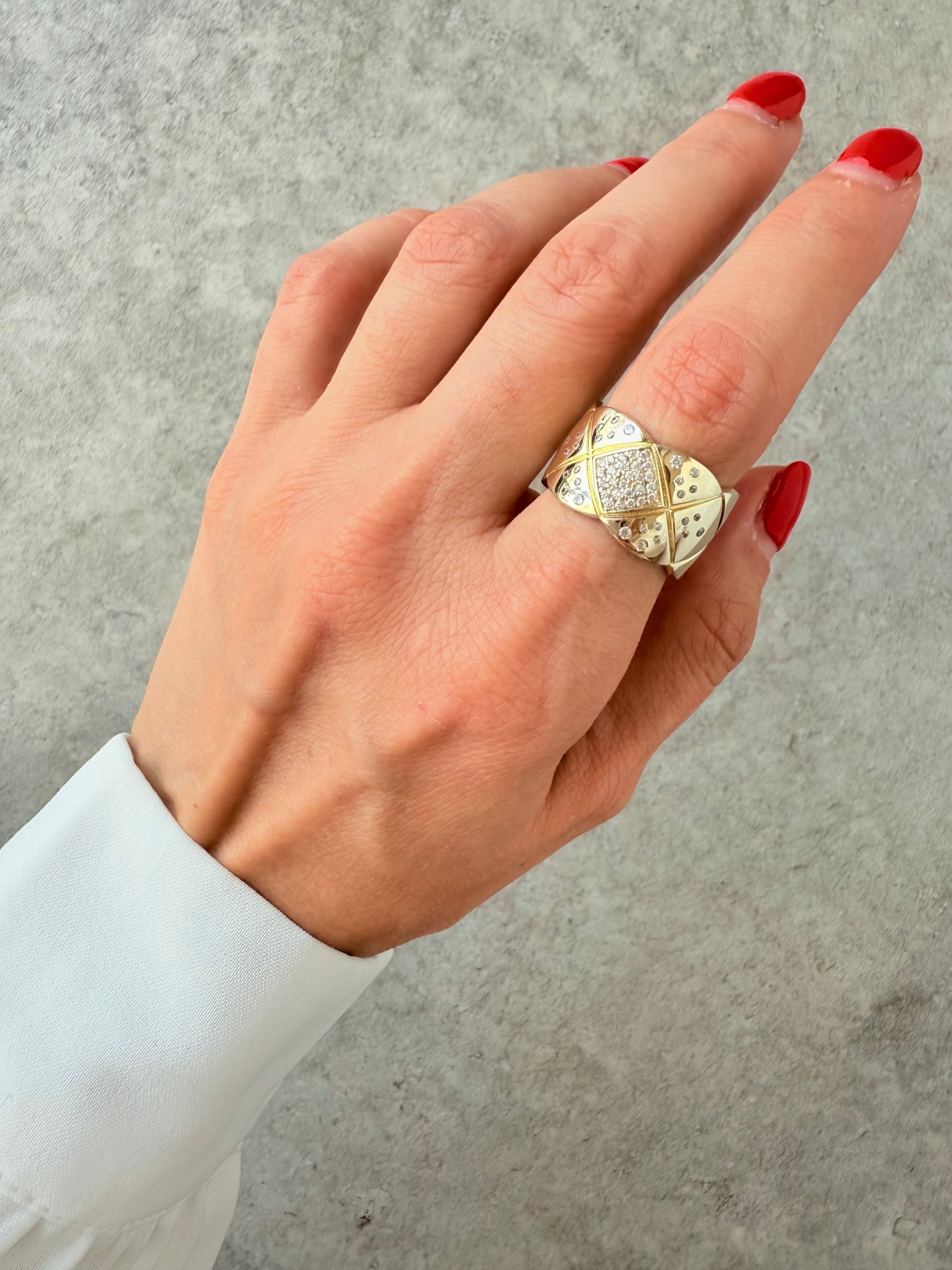 This ring is a statement of modern luxury — a wide gold-plated band featuring a diamond-pattern design with pavé-set cubic zirconia at its center. The geometric detailing and high-polish finish create a sculptural, luminous piece that radiates confidence and sophistication.
