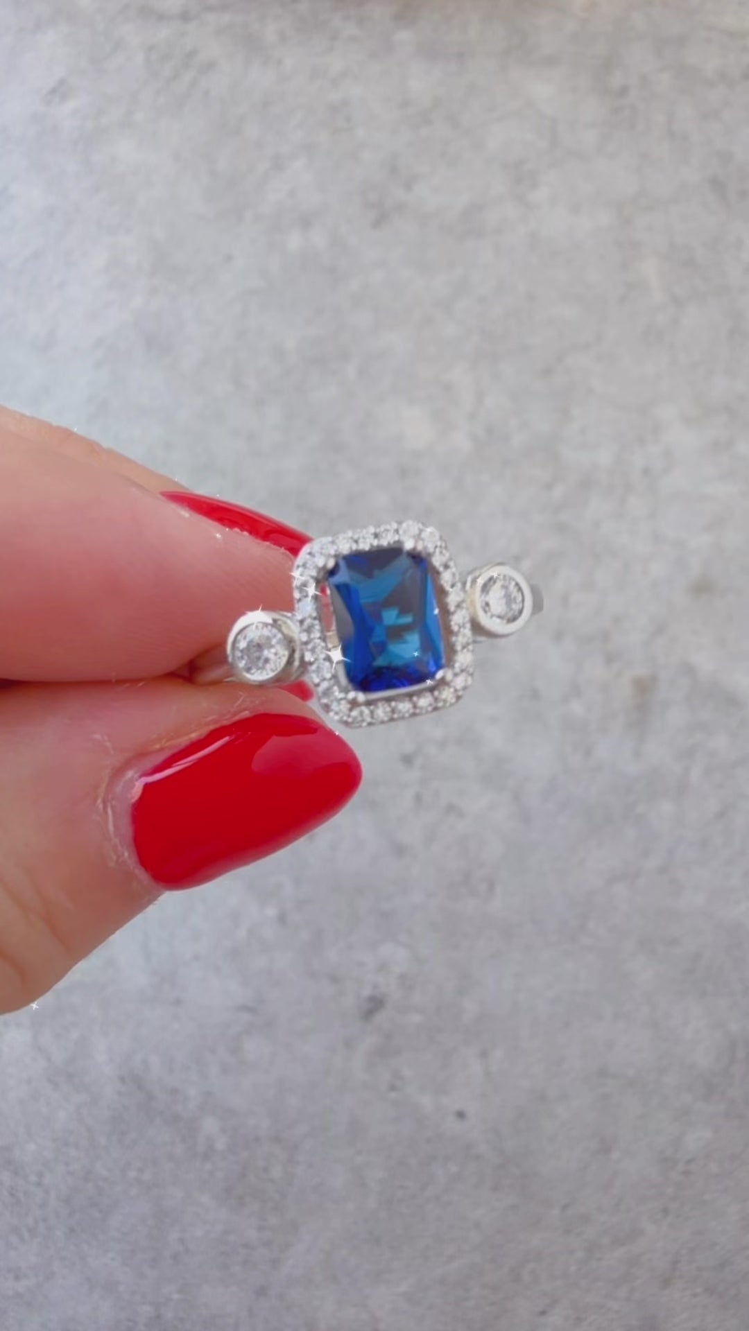 Add a touch of timeless elegance to your style with this sterling silver ring, featuring a striking rectangular sapphire-blue stone at its center. Surrounded by a delicate halo of sparkling zircons and accented with two brilliant side stones, this ring combines sophistication with modern charm.