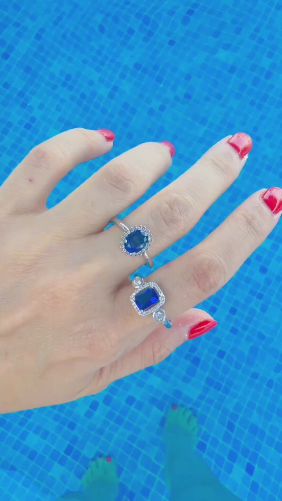 - Center stone: Rectangular-cut sapphire-blue zircon