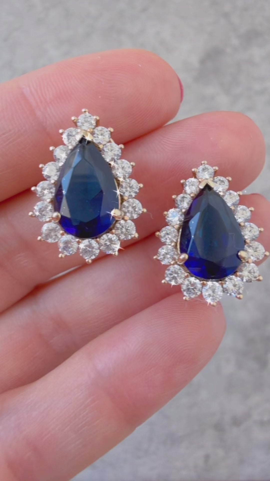 - Main Stone: Sapphire simulant (pear-cut, deep blue)
